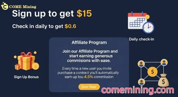 COME Mining gaat verder dan traditionele miningdiensten met zijn lucratieve affiliateprogramma. Gebruikers kunnen vrienden uitnodigen en tot 4,5% commissie verdienen op hun contracten. Dit betekent dat uw netwerk kan groeien naarmate uw mininginkomsten groeien, waardoor u een duurzame passieve inkomstenstroom kunt opbouwen.