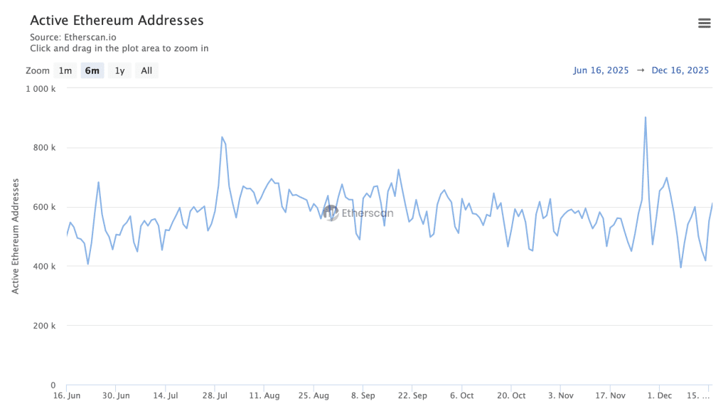 Ondertussen daalde de activiteit op het Ethereum-netwerk steeds verder. Het aantal actieve ethereum-adressen zakte de afgelopen maanden terug naar het laagste punt van de afgelopen half jaar. Ook dat kan voorzichtigheid aanduiden, of gebrek aan vertrouwen.